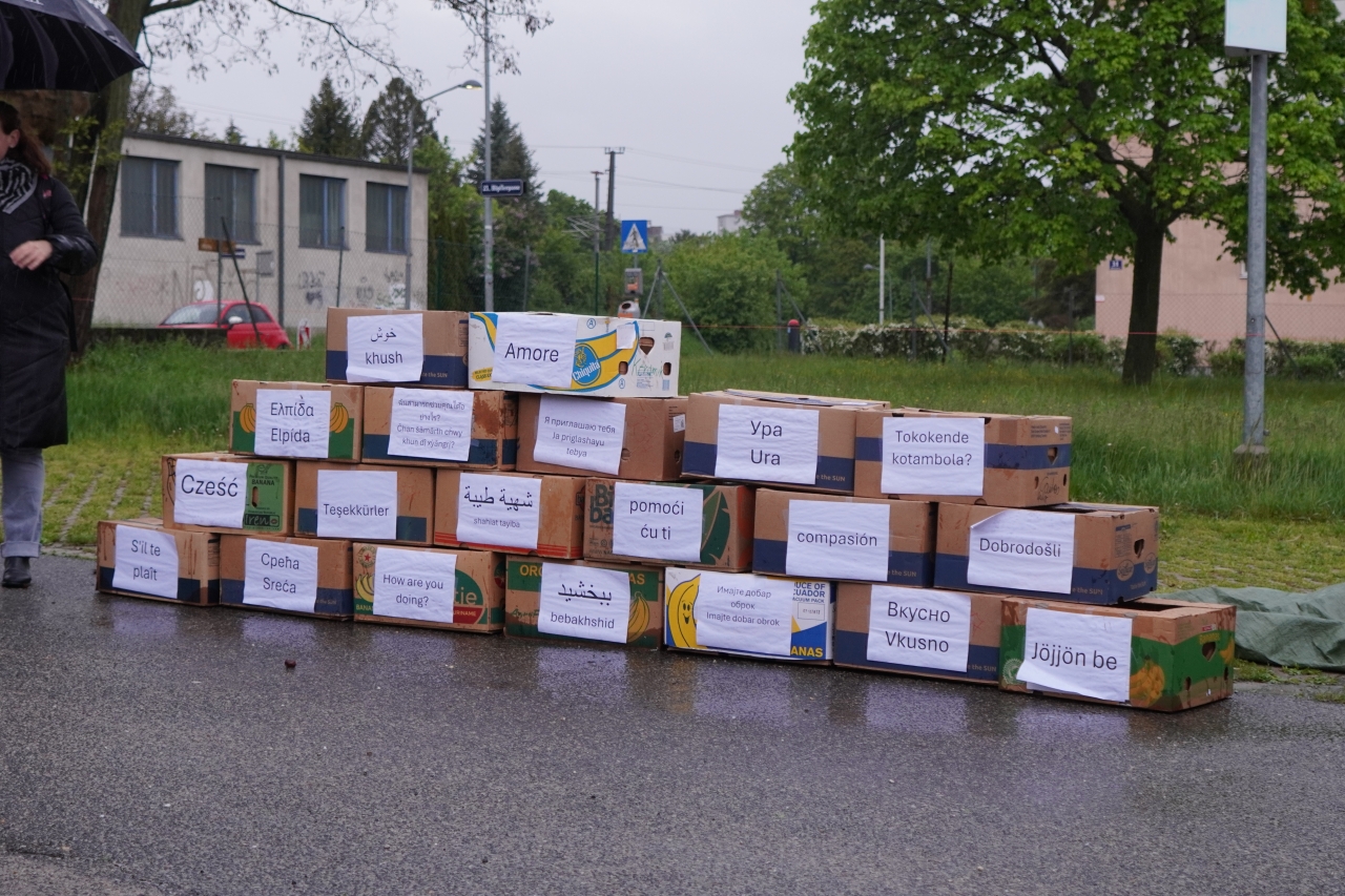 Durch die Dirmhirngasse ging es weiter zur Evangelischen Kirche, wo es einen kurzen Zwischenstopp gab, bevor wir durch die Fußgängerzone Mehlführergasse und unter die Unterführung der S-Bahn Atzgersdorf zum ÖIF-Gebäude in der Lastenstraße 19 gelangten (hier gibt es Sprachkurse). Dort verbarg sich unter einer Plane eine Mauer aus Bananenkartons mit aufgeklebten Sprüchen in den verschiedensten Sprachen- vorne in einer fremden Sprache, hinten auf Deutsch. Ajub, der vor einigen Jahren auch hierher zugewandert ist, zeigte uns anschaulich auf, wie schwierig es ist, Deutsch zu lernen und wie es am einfachsten geht- durch Kontakt mit Einheimischen. Anschließend gelang es uns, aus der Mauer eine Brücke zu bauen, indem wir das Rätsel um die Fremdwörter auflösten. Singend gingen wir weiter, begleitet von der Gitarre, immer noch im Regen, bis zur letzten Station, der Erlöserkirche. Hier gab es eine Aktion mit Häferln: Wir schrieben auf Zetteln nette Willkommensgrüße für neu Zugezogene und steckten die Zettel in die Becher. Diese wurden von einer Mitarbeiterin der Caritas mitgenommen. Eine engagierte Caritasmitarbeiterin aus Altsimmering berichtete über das Organisieren von Wohnungen für Geflüchtete durch engagierte Pfarrmitglieder. Schließlich erzählte uns Hala, eine Sozialarbeiterin aus Syrien, die seit 10 Jahren in Österreich lebt, wie schwierig es für Geflüchtete ist, hier eine Wohnung zu finden und dass das Kostenverhältnis der Miete zum Einkommen viel zu hoch ist.