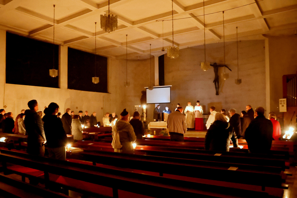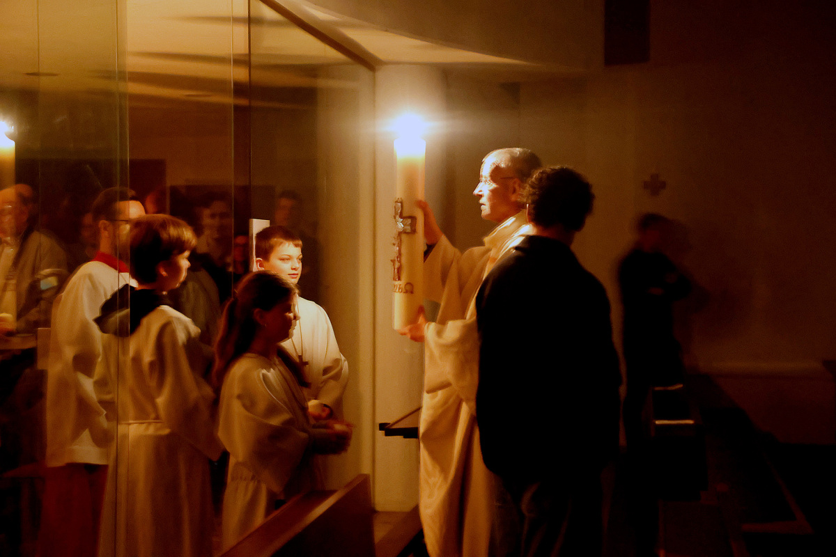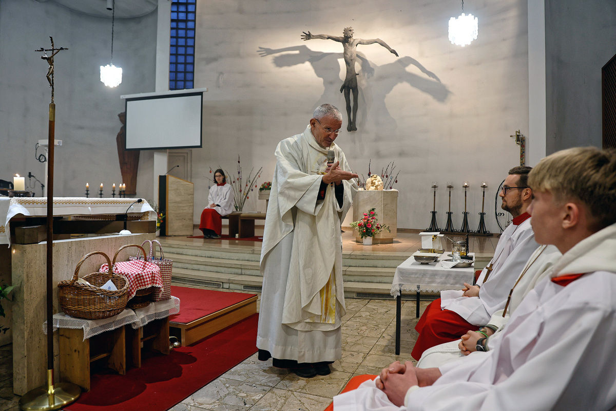 Die Feier ging weiter mit der Allerheilgen-Litanei, unserer Erneuerung des Taufversprechens, mit der Segnung des Wassers im Taufbrunnen und der Eucharistiefeier. Nach der Kommunion in beiderlei Gestalten und der Speisesegnung, beendete GV Nikolaus die Heiligen Drei Tage mit seinem Ostersegen.
