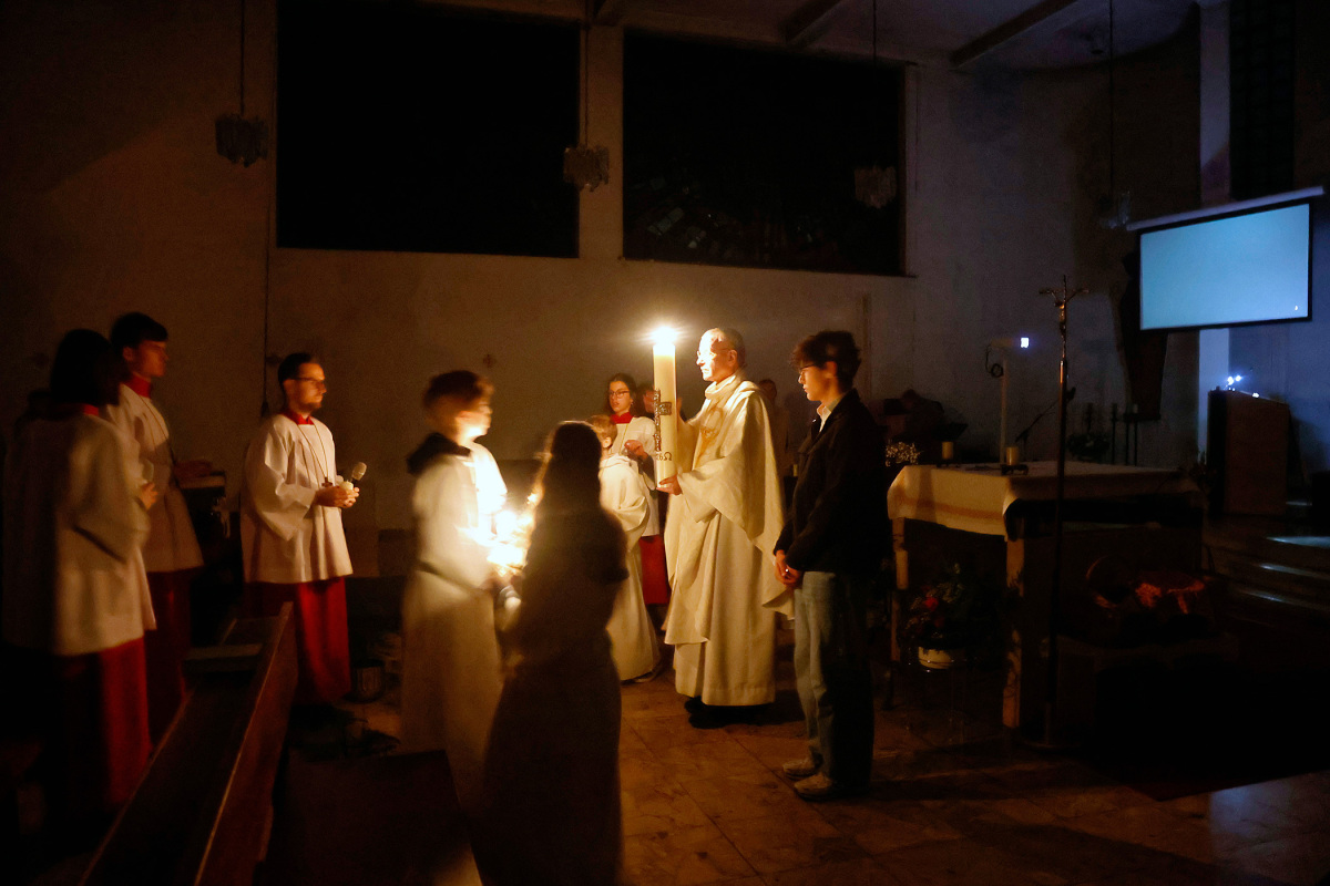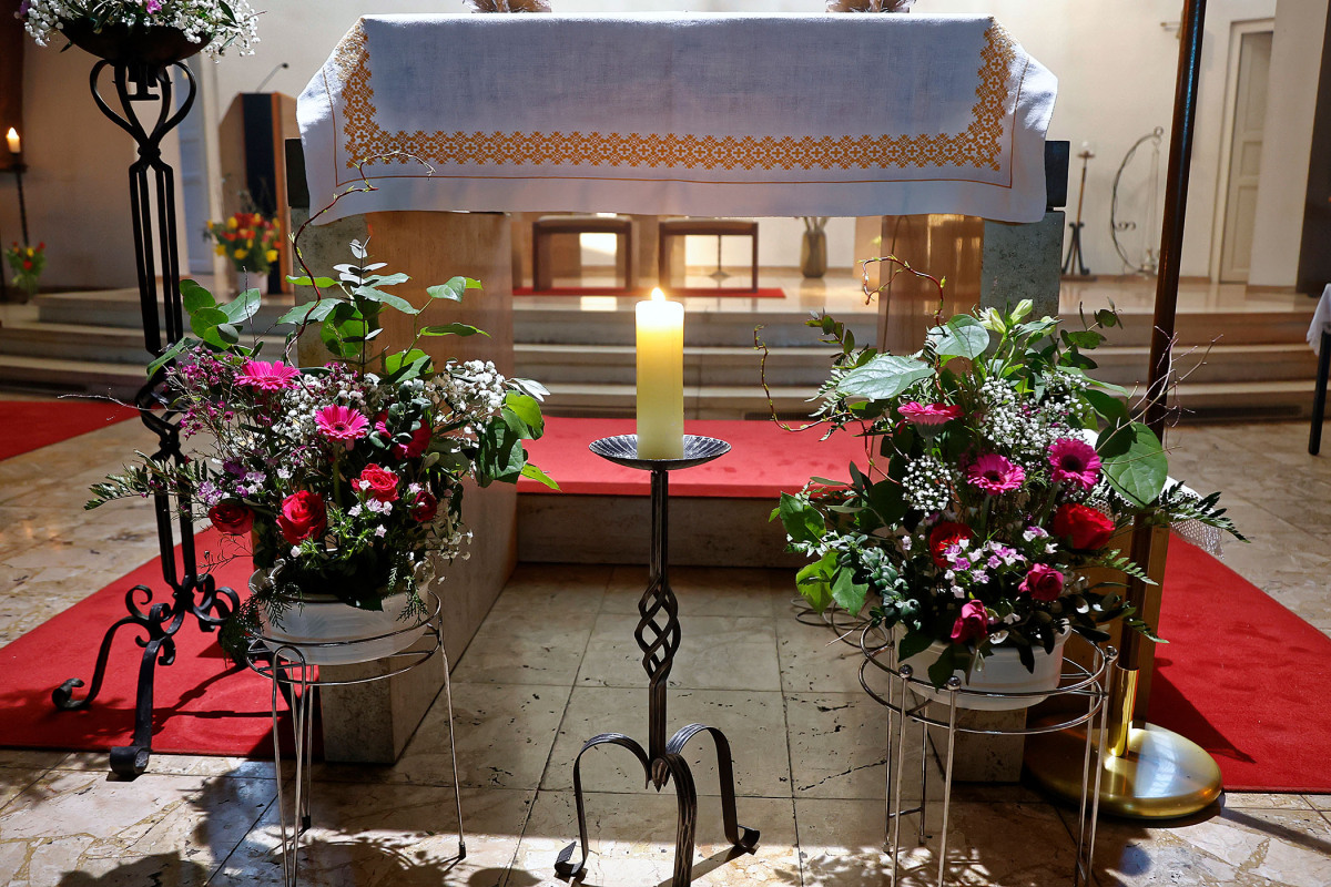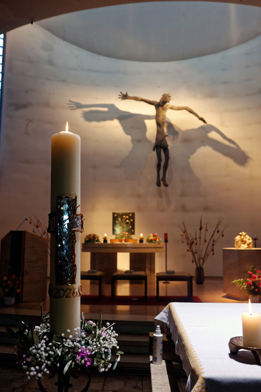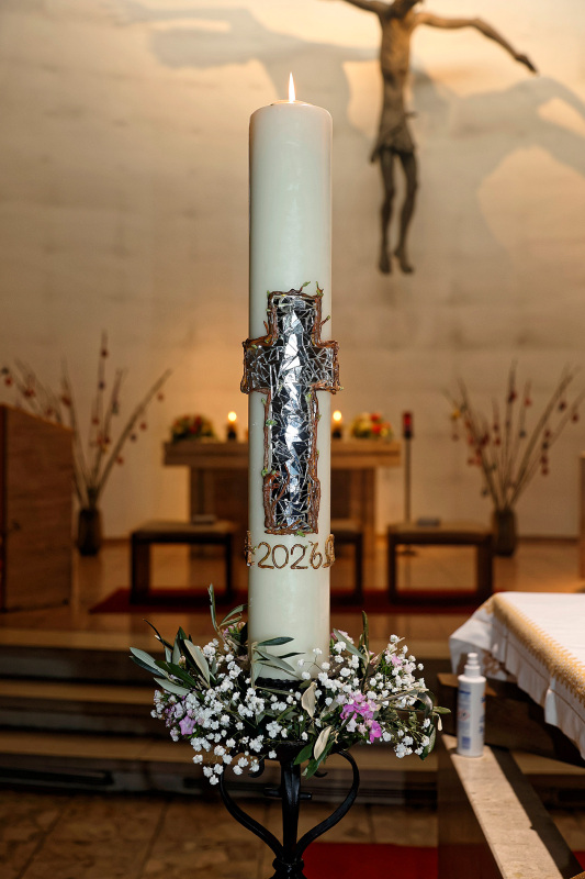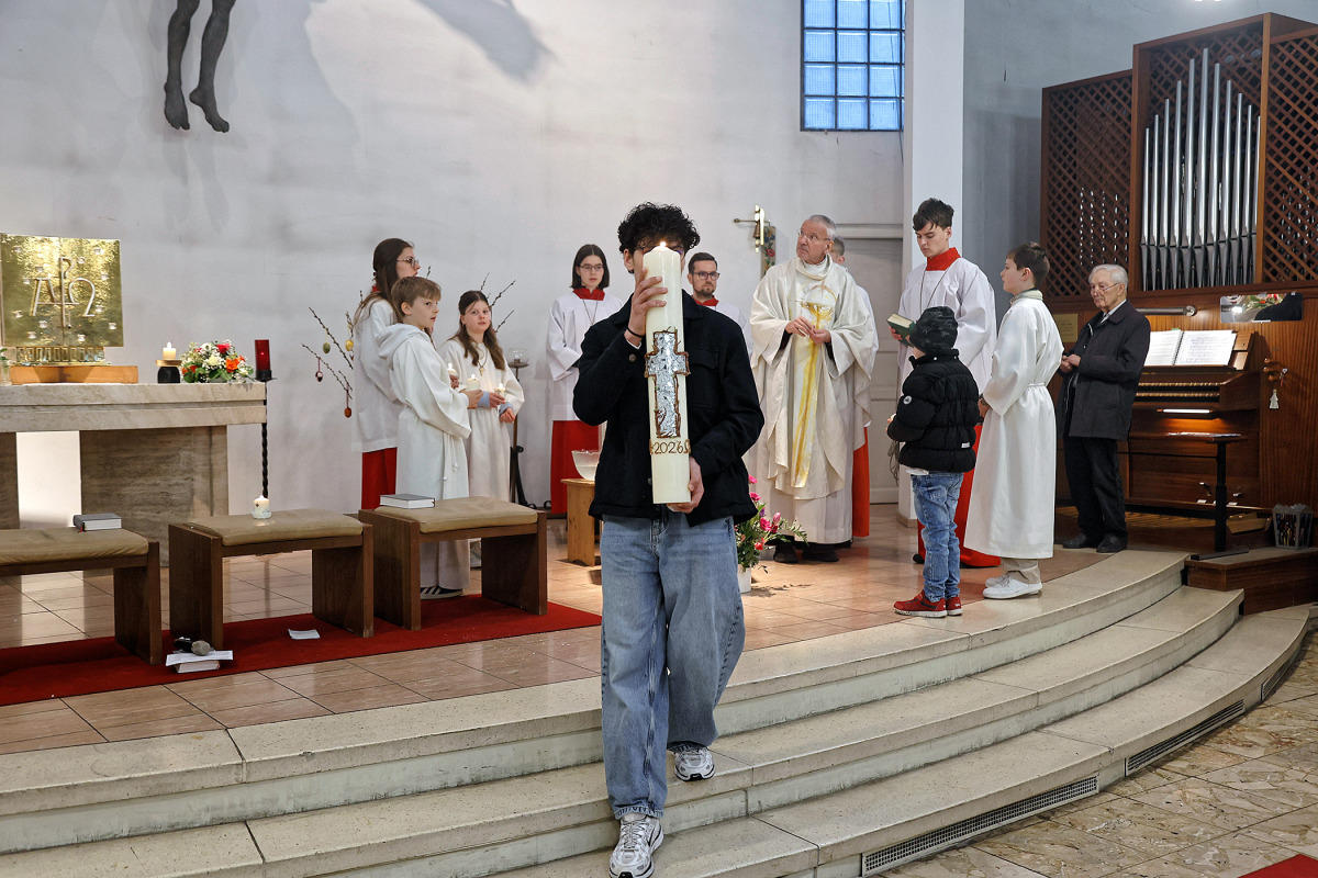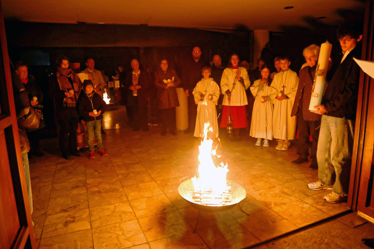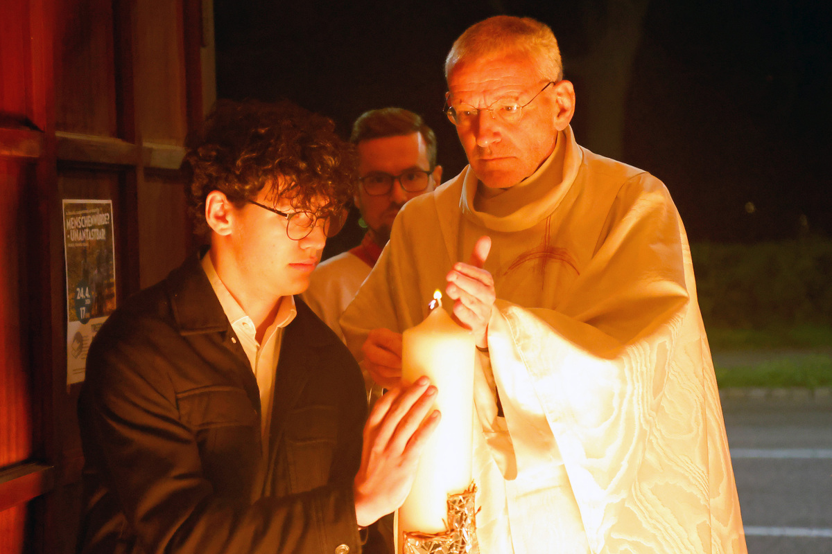 Wir starteten mit der Segnung des Osterfeuers und dem Entzünden der Osterkerze. Nur Kerzenlicht erhellte unsere Kirche beim Exsultet und bei den 4 Lesungen aus dem Alten Testament bis zum Gloria. Die ersten Lichter gingen an , die Glocken läuteten wieder und die Orgel setzte ein. Nach der Lesung aus dem Neuen Testament, stimmte Nikolaus das Halleluja an. Auf das Evangelium antworteten wir mit „Der Heiland ist erstanden“. Der Herr Generalvikar fasste in seiner Predigt noch einmal die Österliche Bußzeit zusammen, die wir am Aschermittwoch mit dem Betrachten unseres Spiegelbildes begonnen haben. Wörtlich sagte er zum Ostersonntag: „Erleuchtet durch das Licht Christi – ausgehend von der Osterkerze – beginnen wir zu strahlen“.
