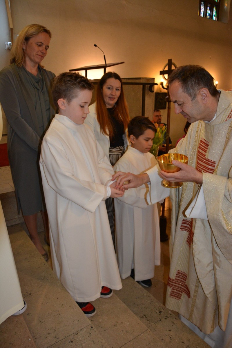 Durch die heuer etwas kleinere Schar von Erstkommunionkindern wurde die Messe umso persönlicher. Der Jugendchor machte die Feier noch lebendiger und Pfarrer Martins Erzählung von einer 94 Jahre alten Dame, die täglich in die Messe kommt, weil es ihr Brot für den Alltag ist, beeindruckte unsere Erstkommunionkinder. Eine gemütliche Agape und ein Erstkommunionausflug am folgenden Tag rundeten dieses besondere Ereignis gebührend ab.