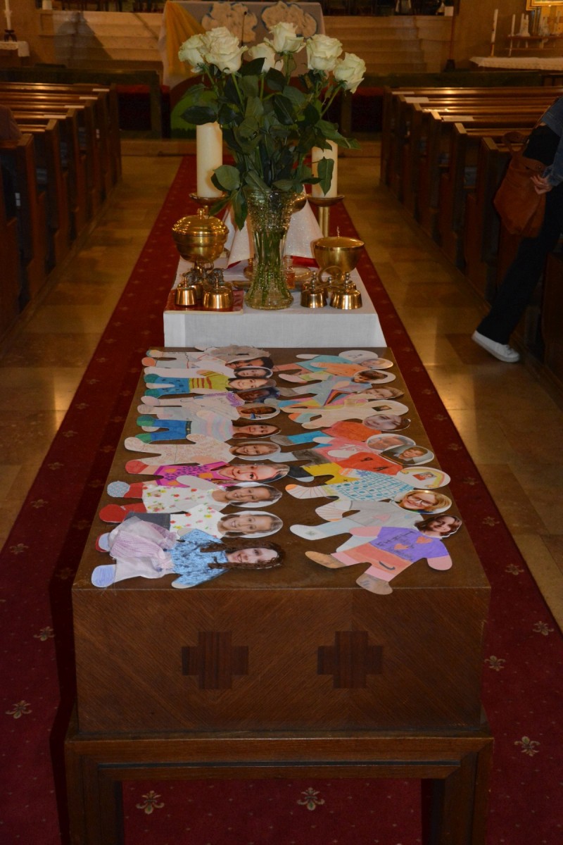 Die Kinder feierten bewusst und freudig: Mit ihren Taufkerzen zogen sie ein, begleitet von ihren PatInnen. Sie begrüßten alle, sogar ihre LehrerInnen und die Frau Direktorin, die kamen, um diesen Freudentag mit den Kindern zu begehen. Sie spielten uns die frohe Botschaft von Jesus vor: wie Jesus seinen Jüngern den Heiligen Geist versprochen hat  und wie er sie gesegnet hat, bevor er in den Himmel aufgefahren ist. Und dass die Jünger mit Freude nach Jerusalem zurückgekehrt sind und mit Gott verbunden geblieben sind. Und als Erinnerung können wir in der Kirche eine große Tafel sehen mit allen Erstkommunionkindern – am Berg der Himmelfahrt J