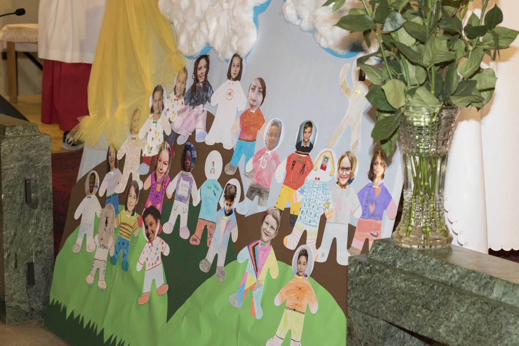Die Kinder feierten bewusst und freudig: Mit ihren Taufkerzen zogen sie ein, begleitet von ihren PatInnen. Sie begrüßten alle, sogar ihre LehrerInnen und die Frau Direktorin, die kamen, um diesen Freudentag mit den Kindern zu begehen. Sie spielten uns die frohe Botschaft von Jesus vor: wie Jesus seinen Jüngern den Heiligen Geist versprochen hat  und wie er sie gesegnet hat, bevor er in den Himmel aufgefahren ist. Und dass die Jünger mit Freude nach Jerusalem zurückgekehrt sind und mit Gott verbunden geblieben sind. Und als Erinnerung können wir in der Kirche eine große Tafel sehen mit allen Erstkommunionkindern – am Berg der Himmelfahrt J