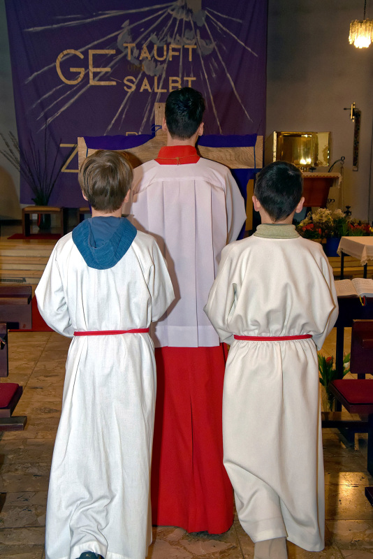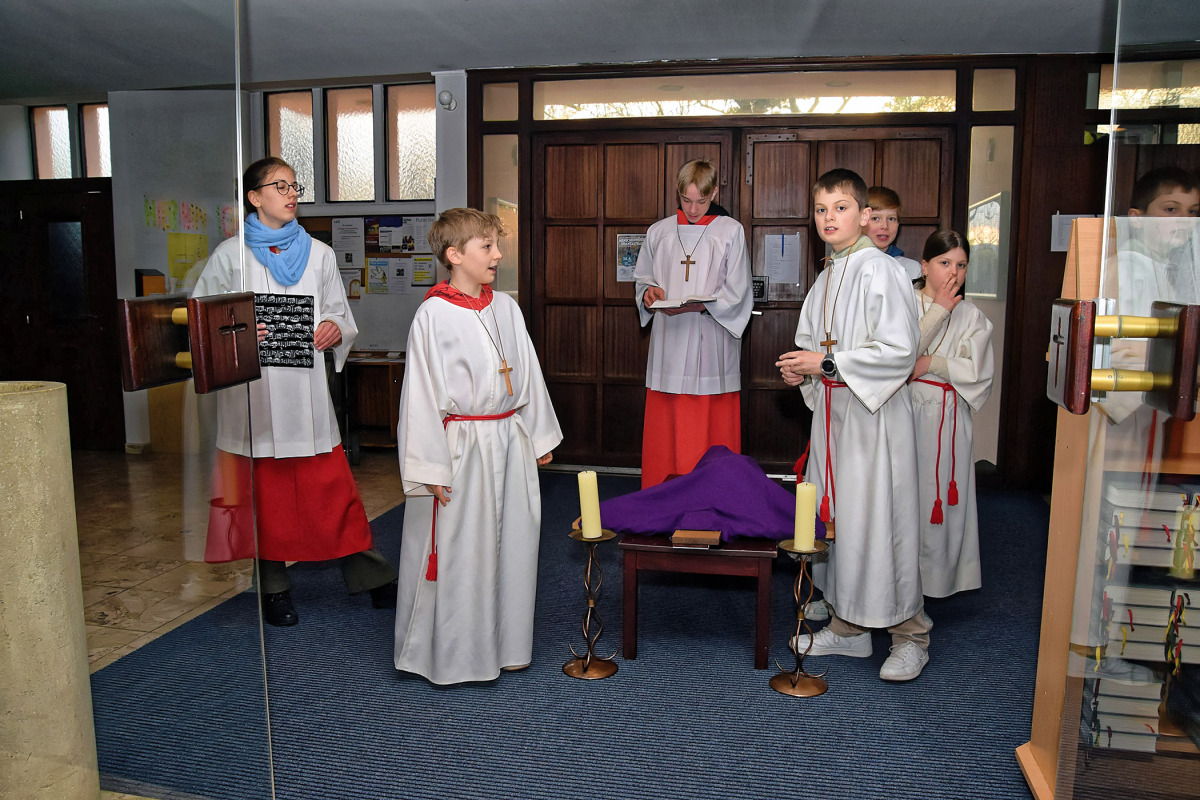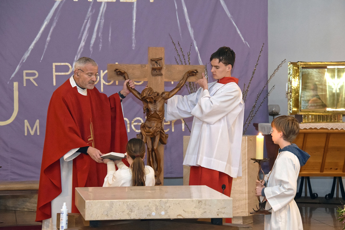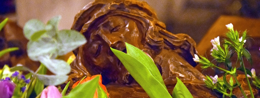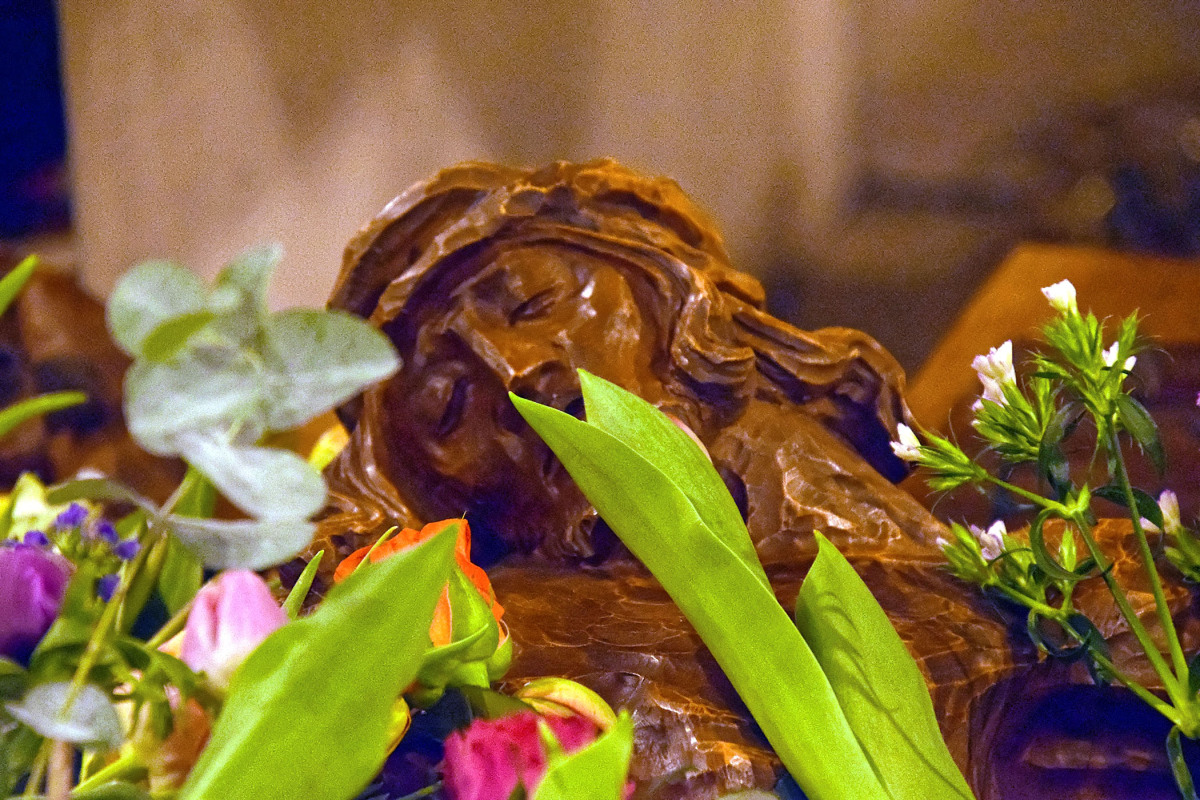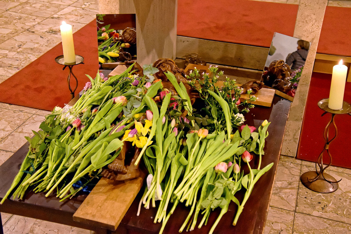 Die Karfreitagsliturgie gedenkt dem Leiden und Sterben unseres Herrn Jesus Christus mit besonderen Abschnitten – 2 Lesungen – Passionsgeschichte nach Johannes – Große Fürbitten – Kreuzverehrung, in Schönbrunn-Vorpark schon seit vielen Jahren in Verbindung mit Blumen. Bei der Kreuzverehrung kamen auch wieder die Spiegel ins Spiel, die uns seit dem Aschermittwoch begleitet haben. So konnten wir uns beim Niederlegen der Blume auch selbst sehen und so alle unsere persönlichen Sorgen zum Kreuz bringen.