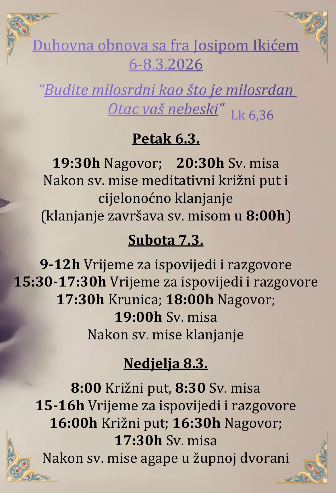 Dragi župljani, najavljujemo korizmenu duhovnu obnovu sa fra. Josipom Ikićem koja će se održati od 6. do 8. 3. pod naslovom: “Budite milosrdni kao što je milosrdan Otac vaš nebeski.”  Lk 6, 36