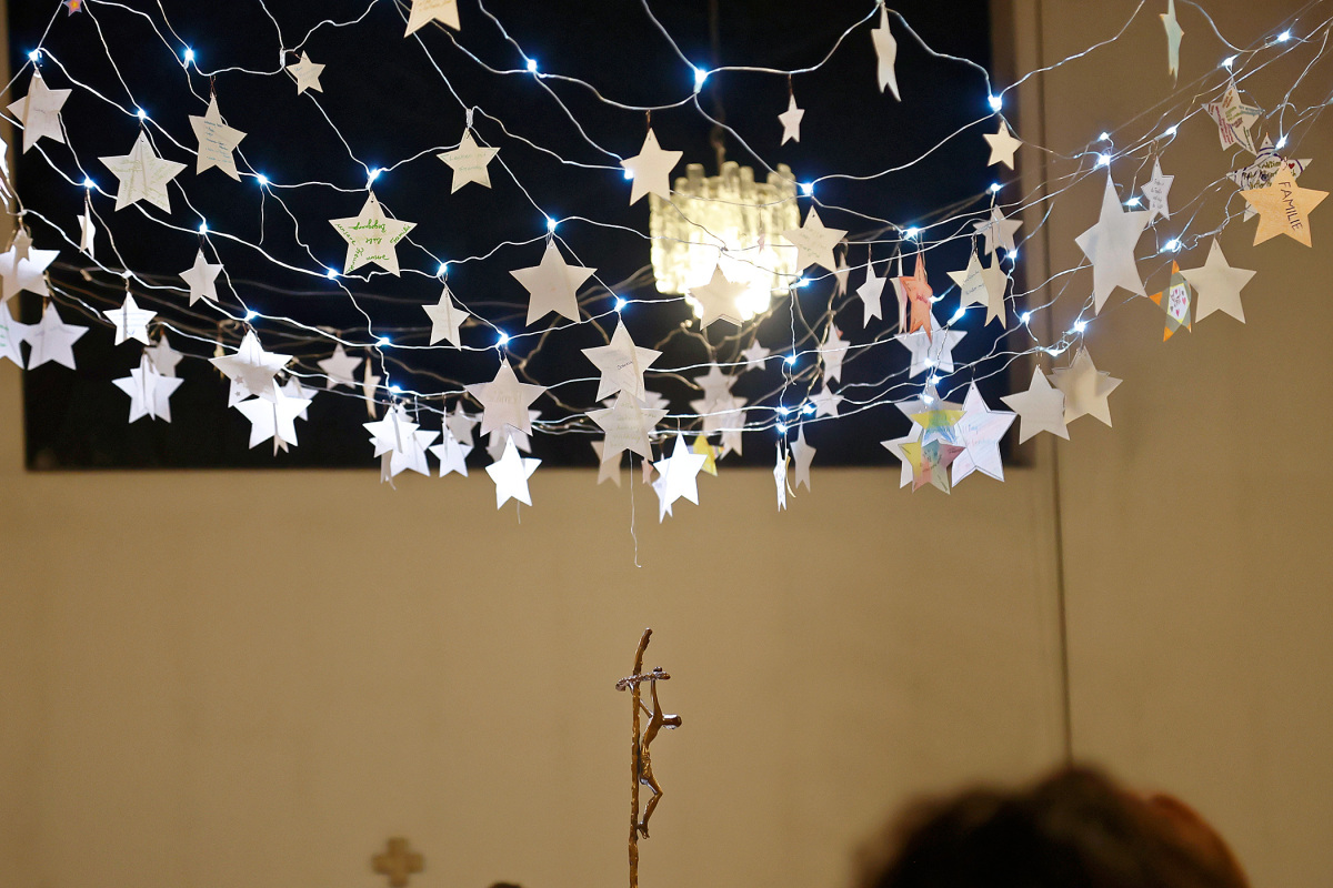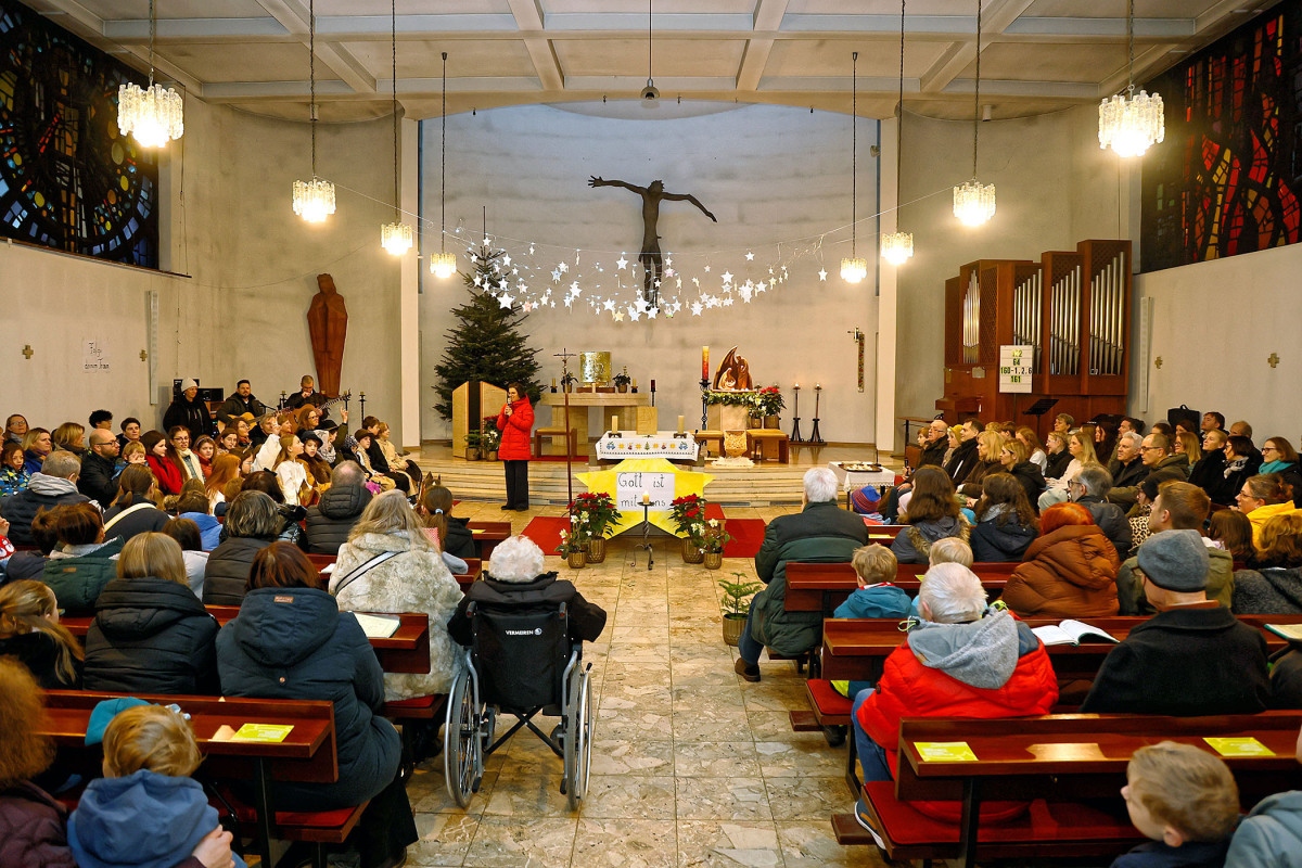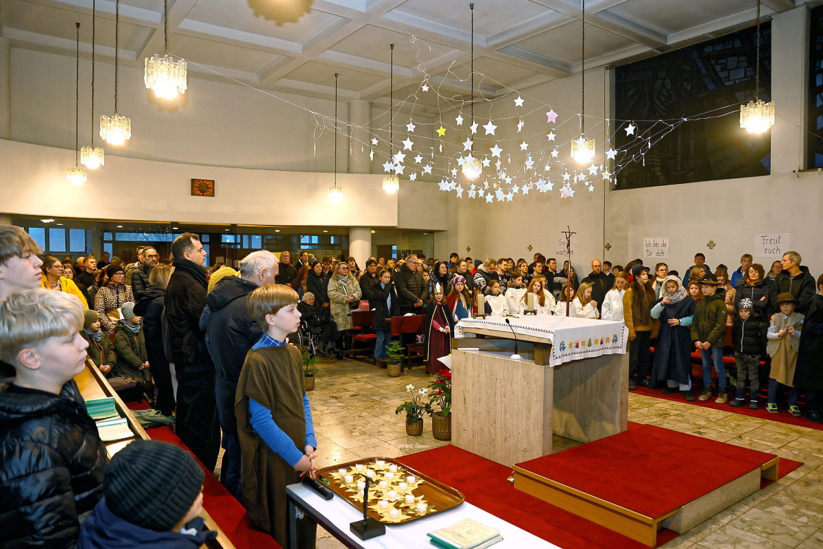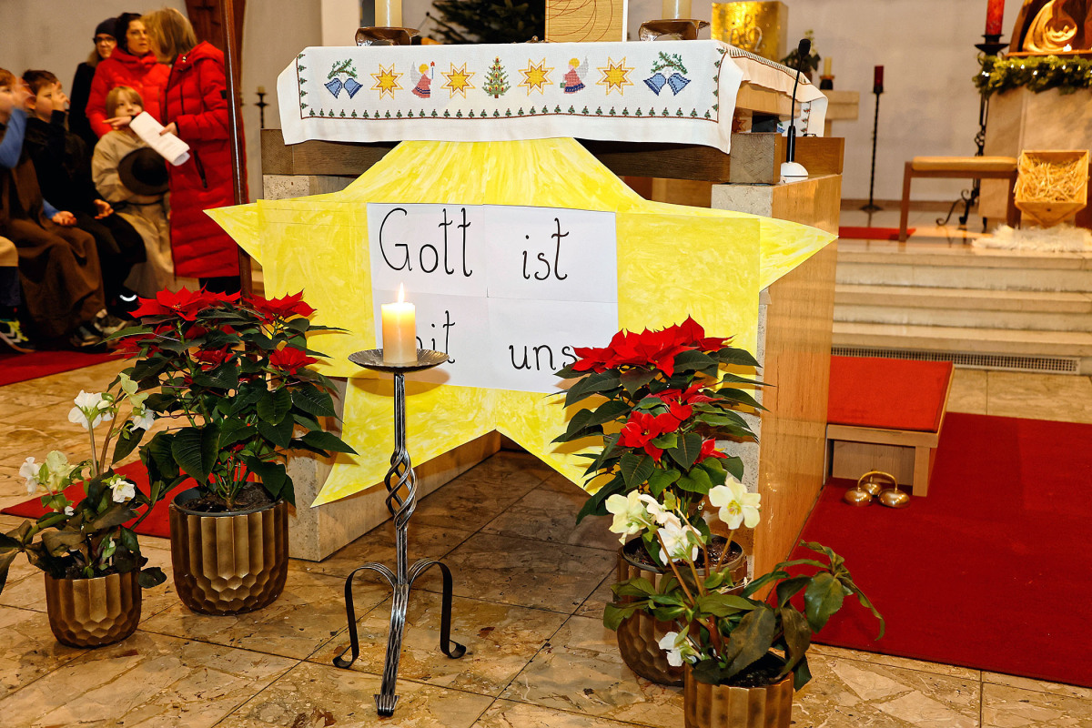Die Adventkränze wurden gesegnet und die erste Kerze am großen Kranz entzündet. In einem kurzen Gespräch nach dem Evangelium erarbeitete Petra mit den Kindern die besondere Botschaft des heutigen Sonntags. „Seid wachsam“, so steht es auch auf dem Stern, der uns durch den Advent begleiten wird.