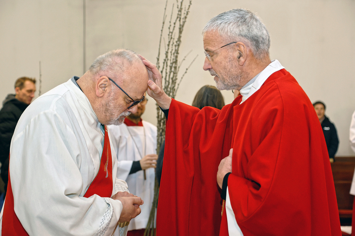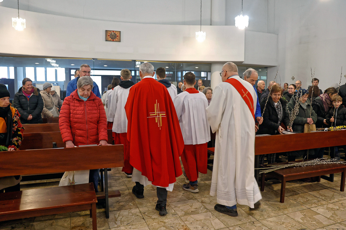 Auch wenn es das Wetter leider nicht gut mit uns meinte, feierten wir den Palmsonntag beeindruckend und stimmungsvoll. Ein Beginn im Auer-Welsbach-Park war leider nicht machbar, daher starteten wir mit der Segnung der Palmzweige im Vorraum der Kirche. Generalvikar Nikolaus Krasa, der von Diakon Arthur und 13 Minis unterstützt wurde, stand bereits zum neunten Mal seit 2012 am Palmsonntag unserer Zelebration vor. Unsere Ministrantinnen und Ministranten, die sich auf die Ereignisse schon seit Samstag vorbereitet und im kleinen Saal übernachtet haben, brachten uns gut vorbereitet und in verteilten Rollen gemeinsam mit GV Nikolaus die Matthäus-Passion nahe. Auch die kleinen Spiegel, die uns schon seit dem Aschermittwoch begleitet haben, standen erneut im Fokus und wurden von den Gläubigen vor dem mit Palmkätzchen geschmückten Altarkreuz niedergelegt.