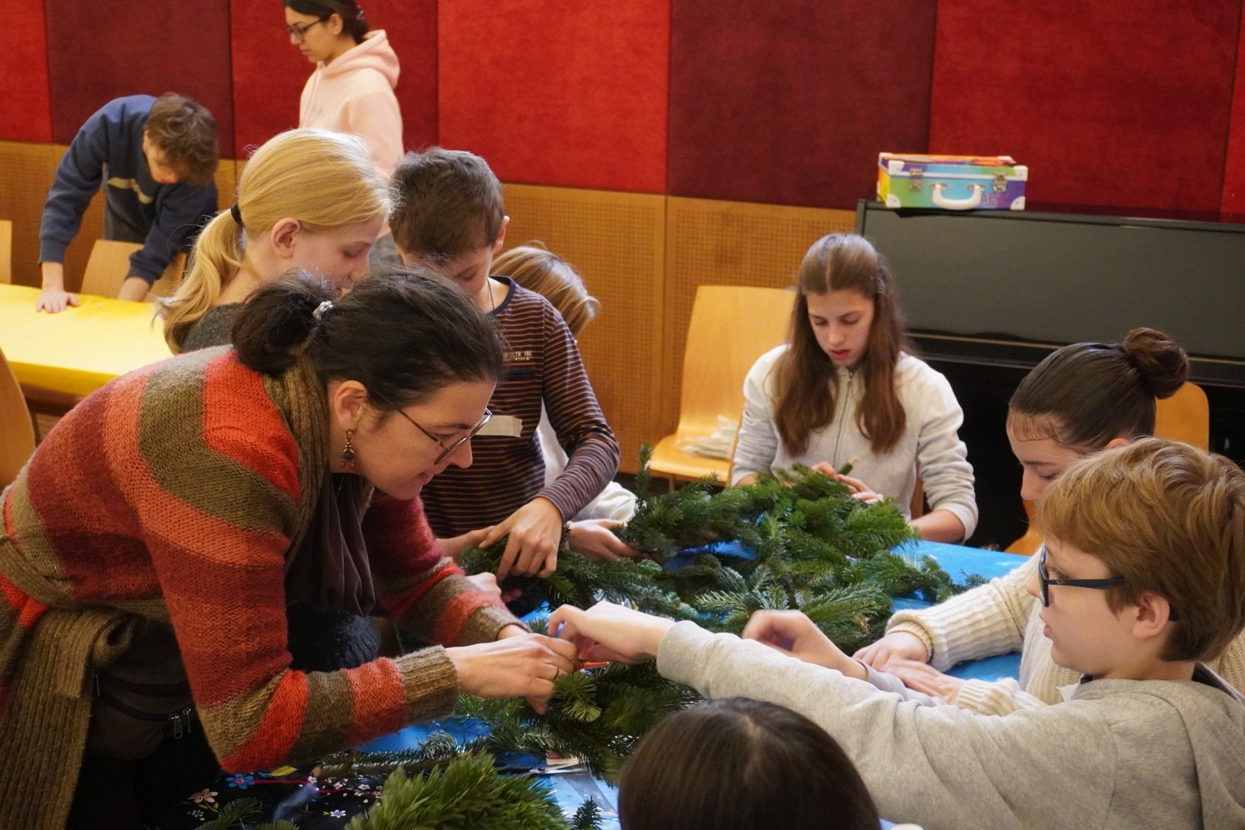Rund um einen Tisch voller duftendem Reisig hatten inzwischen Kinder und Firmlinge aus Schönbrunn-Vorpark mit dem Adventkranzbinden begonnen. Die Damen im Seniorenheim freuten sich ganz besonders über diese Kränze mit bunten Schleifen und LED-Lichtern. Einige Jugendliche der Fokolar-Bewegung waren den Vormittag über mit dem großen Adventkranz für die Kirche beschäftigt. Mit Pfarrer Martin konnten wir schließlich auch noch ein TikTok-Video zum Advent machen.