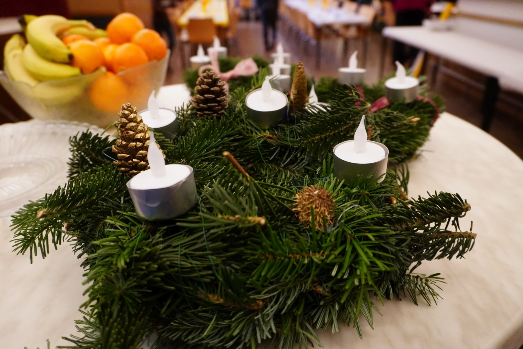 Rund um einen Tisch voller duftendem Reisig hatten inzwischen Kinder und Firmlinge aus Schönbrunn-Vorpark mit dem Adventkranzbinden begonnen. Die Damen im Seniorenheim freuten sich ganz besonders über diese Kränze mit bunten Schleifen und LED-Lichtern. Einige Jugendliche der Fokolar-Bewegung waren den Vormittag über mit dem großen Adventkranz für die Kirche beschäftigt. Mit Pfarrer Martin konnten wir schließlich auch noch ein TikTok-Video zum Advent machen.