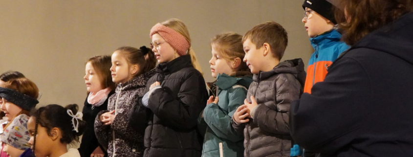 Sie feierten mit vielen anderen Kindern einen Kinderwortgottesdienst mit einer Klanggeschichte. Dann stellten sie sich mit einem Lied vor.