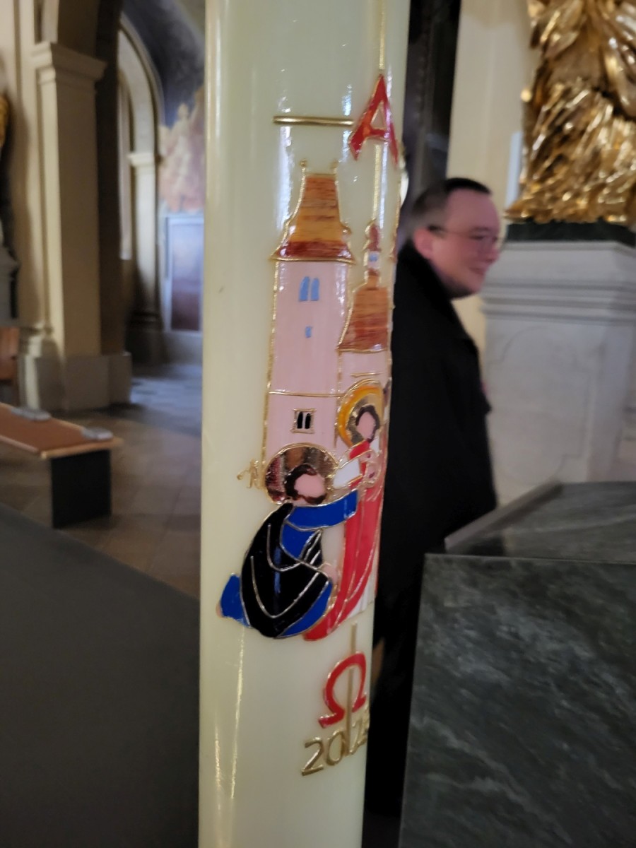Mit einem geistlichen Impuls vor der Kirche von St. Lorenzen startete die letzte Etappe zum Stift Vorau, das schon in Sichtweite gerückt war. Bei zwar frischem, aber sonnigerem Wetter ging es nun bergauf, bergab durch grüne Wiesen und schöne Wälder bis zum Ziel in Vorau. Vor der abschließenden Messe im Stift Vorau wurden wir im Vorauer Hof mit einem hervorragenden Mittagessen verwöhnt. Pater Thomas, der mit uns die Messe feierte, zeigte uns dann auch noch die Basilika und die Sakristei der Stiftskirche.