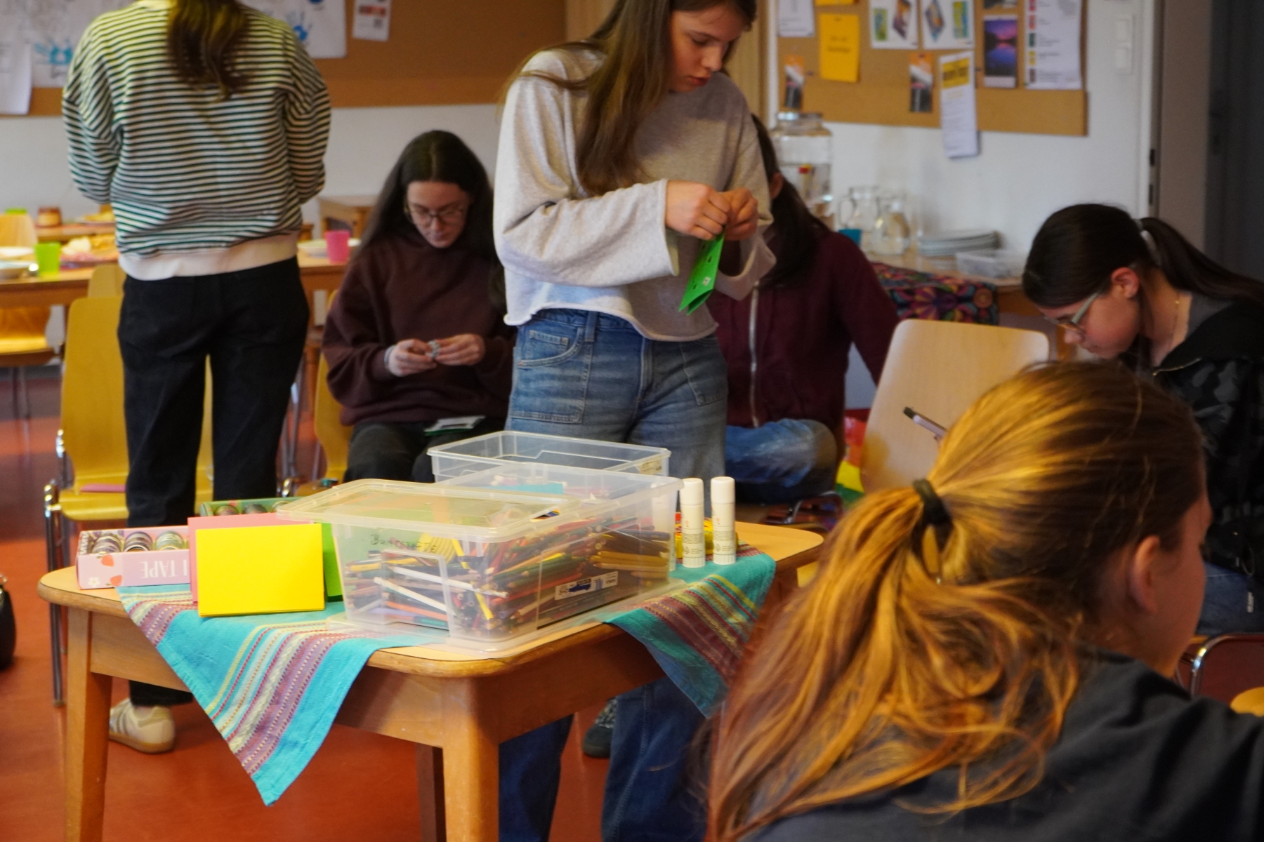 So wie nach der mexikanische Tradition am „Día de los muertos“ Fotos der Toten aufgestellt werden, haben auch wir bunte Billette mit dem Namen und/oder Foto von lieben Verstorbenen gebastelt. Dabei öffneten wir den Raum, schöne Erinnerungen an unsere Lieben miteinander zu teilen. Danach haben wir gemeinsam gegessen, wobei die Billette stellvertretend für die lieben Verstorbenen mit auf dem Tisch standen.